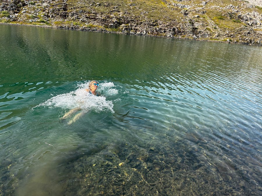 So many mosquitoes from Sisters Mirror Lake, we ate in the tent which is a big no no. From there on, beautiful days and many snow fields to cross. Handed out fresh fruit & veggies…