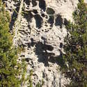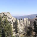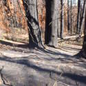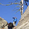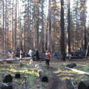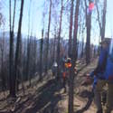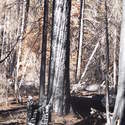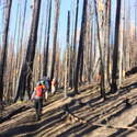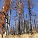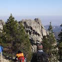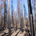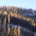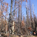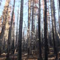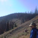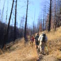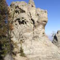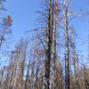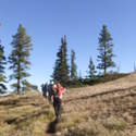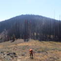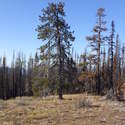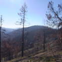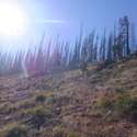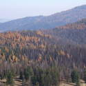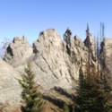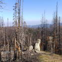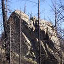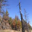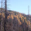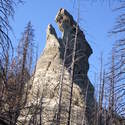 Another beautiful day for a hike and the thinking was to head over to Mount Lillian and the site of the 2012 Tabletop Fire to see the last hurrah of this year's larches. With sunny skies and a brisk temperatures, we started out from the Ken Wilcox Horse Camp, across from Haney Meadow. Following FR 9712 for a short walk we turned onto the Naneum Meadows Trail and in a brief time the first larches came into view. After a short climb we picked up the Mt. Lillian Trail and headed through a forest once green now burned, wounded watchmen of the woods, blackened and broken, seared and scarred, twisted into monstrous shapes by the merciless flames of a conflagration that will be forgotten in time, standing as best they can as we passed solemnly by. Here and there a patch of forest was spared for no known reason. There was an other worldly coolness in the air as we passed through, as though the denizens of the forest had colluded to lower the temperature in an effort to forget the searing heat of the fire that attempted to destroy their home. After a while we came to a meadow with a viewpoint that looked out on layers of mountains, larches golden in the sun, and even Rainier and Stewart wearing their mantles of white. Onward along a ridge we stood upon Lilian's heights and gazed out on a world alive and colorful, as the forest behind us stood silent in black and ash. Spires of sandstone arrested our views and sparked our imaginations. After a brief detour to climb a nearby knoll, having first paid our respects to the deceased of the woods, we headed back to Lillian and descended down to the base of the sandstone sculptures which we eagerly investigated with eyes, hands, and feet. Like children on a playground, we explored the formations, climbing up and down those we felt brave enough to test our mettle against. We then proceeded down the Mt. Lillian Trail until we came to FR 9712 which we followed for but a few minutes whence we arrived at the Howard Creek Trail which bid us welcome and, following the trail's namesake, we strolled along the often rutted trail through green and gray and black until wecame soon to the Old Ellensburg Trail which led us back to Haney Meadows first alongside a hill in bright sunshine then through a chilled, thinned forest, death displayed alongside life, and a last short road walk to our cars. While hunters were in evidence throughout the area, we met but one during our journey, he admitting that success had thus far eluded him though we, like he, had seen the signs of elk and deer everywhere. Alas, we too were without success for our cameras captured no images of the beasts. Still, it was a memorable trip which left us wondering what it will look like next year.