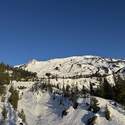 Beautiful sunny day. So warm. Lower mountain did not refreeze overnight. We forgot snowshoes. I thought there would be a good bootpack- nope. It was total mashed potatoes, posthole city, exhausting. Very thin coverage on the Worm flows, so we were able to scramble along the rock spine for a bit, but that was slow too. Then I tweaked my knee and became very worried about further injury, so we turned around. Stressful climbing down, but was such a pleasant view! Lesson learned.